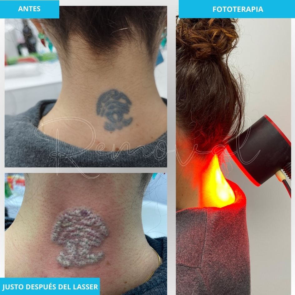Pasado un tiempo prudencial (mínimo 2 meses) repetiremos la operación con algo más de potencia. Harán falta 1 o 2 sesiones para dejar la piel preparada para volver a tatuar encima (cover up) y para una eliminación completa a partir de 3. Insistimos en que el número de sesiones variará según cada caso, por lo que no se puede garantizar un resultado por número de sesiones.